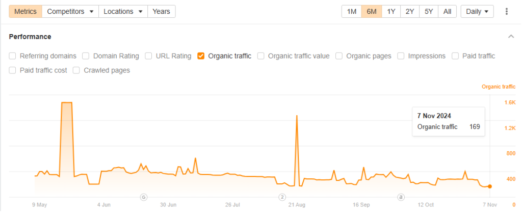 When I audited hiddengardenflowers.com in November 2024, Ahrefs estimated 169 monthly organic sessions. Twelve months later, that figure had reached 24,021.