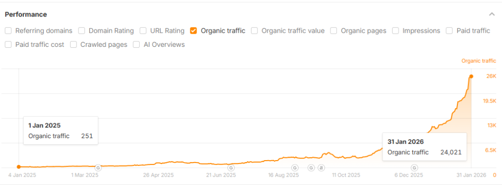 Ahrefs estimated 251 monthly organic visitors to hiddengardenflowers.com on 1 January 2025. By 31 January 2026, that number was 24,021. That’s a 9,470% increase in twelve months.