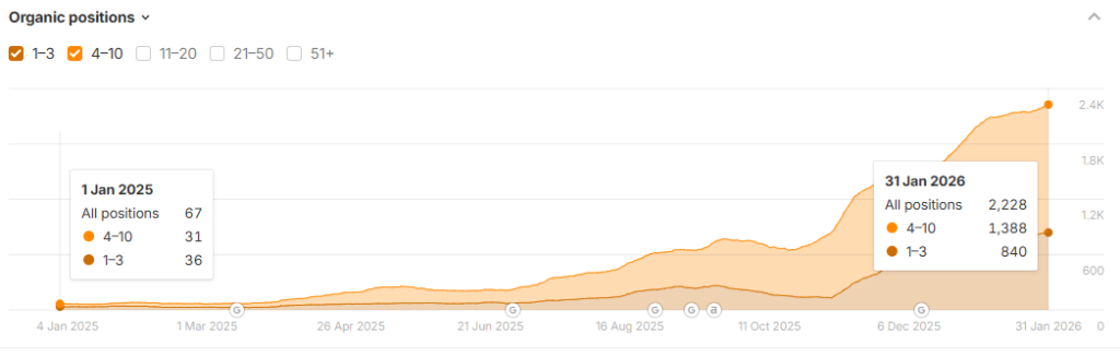 The site had 34 keywords on page one of Google when we started. It now has 1,388. In January 2026 alone, 101 brand-new keywords reached page one for the first time and another 105 existing page-one keywords climbed higher.